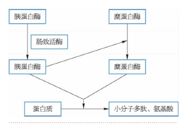 胰蛋白酶和糜蛋白酶共同作用,能使蛋白质分解为小分子的多肽和氨基酸(图6-4-5)。