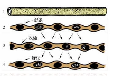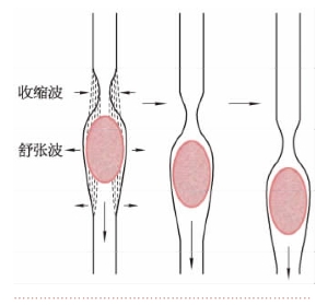 (3)蠕动:蠕动是消化管平滑肌顺序舒张和收缩所形成的一种向前推进的波形运动,是消化管的基本运动形式(图6-4-2)。