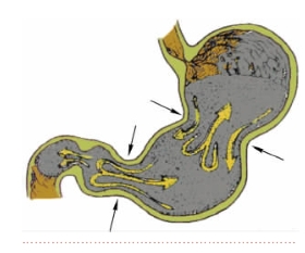 示小部分液体食糜被推进挤过幽门进入十二指肠,大部分食糜则被强力推向胃体进一步磨碎及混匀