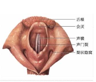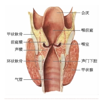喉腔是由喉软骨、韧带和纤维膜、喉肌、喉黏膜等围成的管腔。向上经喉口通喉咽,向下通气管。