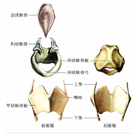 1.甲状软骨 由前缘互相愈合的两块甲状软骨板合成。愈合处称前角,前角上端向前凸出,在成年男子尤为明显,称喉结。甲状软骨板的后缘游离,向上、下发出突起,称上角和下角。