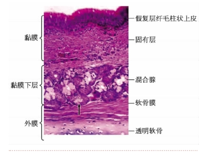 1. 膜 由上皮和固有层构成。上皮为假复层纤毛柱状上皮,主要由纤毛细胞、杯状细胞等构成。固有层为结缔组织,含有丰富的弹性纤维、血管和弥散的淋巴组织等。