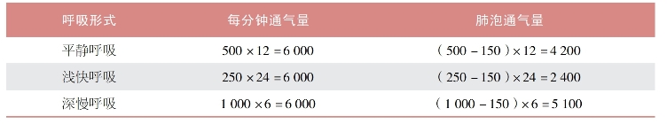 表7-5-2 不同呼吸形式的肺通气量和肺泡通气量(单位:ml/min)