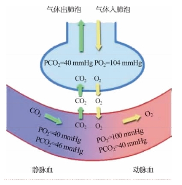 肺泡与肺毛细血管血液之间的气体交换过程称肺换气。肺泡内的PO2(104 mmHg)高于静脉血中PO2(40 mmHg),同时肺泡内PCO2(40 mmHg)低于静脉血中PCO2(46 mmHg),因此,当肺动脉的静脉血流经肺毛细血管时,在分压差的推动下,O2从肺泡扩散入血液,CO2由静脉血向肺泡内扩散(图7-6-1),完成肺换气。结果使静脉血变成了动脉血。