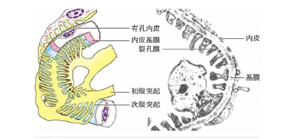 2)肾小囊:是肾小管起始端的球形双层盲囊,由壁层和脏层两层上皮细胞构成,两层上皮间的腔隙为肾小囊腔。壁层为单层扁平上皮。脏层由多突状的足细胞构成(图8-1-10),电镜下可见由胞体伸出几个大的初级突起,从初级突起又垂直发出大量指状的次级突起,相邻的次级突起相互穿插相嵌,呈栅栏状。次级突起间的间隙称裂孔,被裂孔膜覆盖。