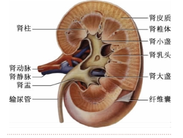 1.纤维囊 纤维囊为紧贴肾实质表面的薄层坚韧致密的结缔组织膜,内含少量弹性纤维。正常情况下,易与肾实质剥离,但在病理情况下,则与肾实质发生粘连,不易剥离。