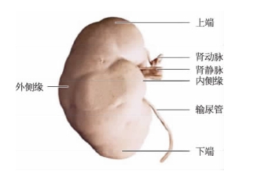 肾是实质性器官,左、右各一,形似扁豆(图8-1-1)。新鲜肾呈红褐色,质柔软,表面光滑。