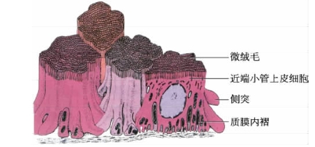 1)近端小管:是肾小管中最长和最粗的一段,约占肾小管总长的一半。近曲小管由单层立方或锥形细胞组成,体积较大,细胞分界不清,胞质强嗜酸性,细胞游离面有刷状缘,基部有纵纹(图8-1-11、图8-1-12)。电镜下可见细胞游离面有大量长而密集的微绒毛,构成光镜下所见的刷状缘。直部的结构与曲部的基本相似。