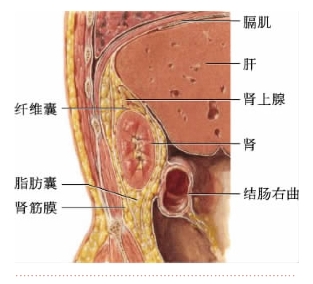 图8-1-6 肾的被膜(经右肾矢状切面)