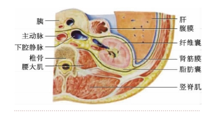 3.肾筋膜 肾筋膜位于脂肪囊的外面,分前、后两层包裹肾及肾上腺。当腹壁肌力弱、肾周脂肪少、肾的固定结构薄弱时,可产生肾下垂或游走肾。肾积脓或肾周围炎症时,脓液可沿肾筋膜向下蔓延,达髂窝或大腿根部。