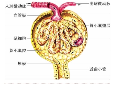 (1)肾小体:呈球形,有微动脉进出的一端为血管极,与近端小管相通连处为尿极(图8-1-9)。肾小体由肾小球和肾小囊组成。
