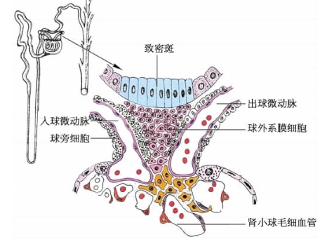 1)球旁细胞:是由入球微动脉管壁平滑肌细胞转变成的上皮样细胞。细胞体积较大,呈立方形,含分泌颗粒,颗粒内含有肾素。肾素可使血管平滑肌收缩,血压升高。