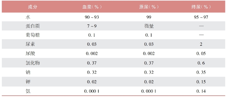 循环血液经过肾小球毛细血管时,在有效滤过压的驱动下,血浆中的水和小分子溶质,包括少量分子量较小的血浆蛋白,可以滤入肾小囊的囊腔而形成原尿(超滤液)的过程,称肾小球的滤过作用。在原尿的生成过程中,血细胞和蛋白质均不能滤出,因此,原尿与血浆的主要区别在于前者蛋白质含量甚少,其他两者基本相同(表8-2-1)。