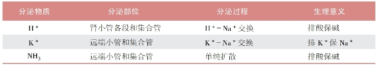 肾小管和集合管的分泌与排泄是指肾小管和集合管的上皮细胞,将代谢产物或血液中的某些物质排入小管液的过程。肾小管和集合管主要分泌H+、K+、NH3,这对保持体内的酸碱和电解质的平衡具有重要意义(表8-2-2)。
