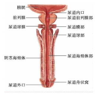 1.前列腺部 为尿道贯穿前列腺的部分,长约2.5 cm,管腔中部扩大呈梭形。其后壁上有射精管和前列腺排泄管的开口。