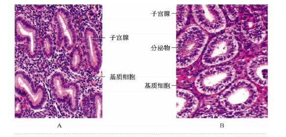 (1)内膜:由单层柱状上皮和固有层组成。上皮向固有层内陷形成许多管状的子宫腺,其末端近肌层处常有分支。固有层较厚,血管丰富,含有大量分化程度较低的基质细胞。