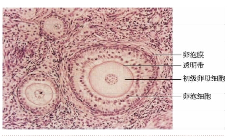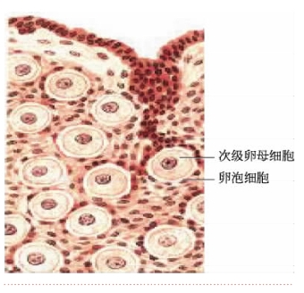 1)原始卵泡:位于卵巢皮质浅层,数量多,呈球状。中央为1个大而圆的初级卵母细胞,周围是一层扁平的卵泡细胞。初级卵母细胞在胚胎期由卵原细胞分裂分化而成,核大而圆。卵泡细胞较小,核呈扁圆形(图9-2-5)。原始卵泡逐渐发育为初级卵泡。