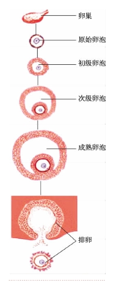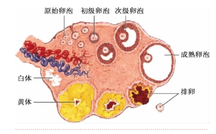 (1)卵泡的发育和成熟:卵泡由一个卵母细胞和包绕它的卵泡细胞组成。卵泡数量随年龄增长而减少。出生时,双侧卵巢约有100万个原始卵泡,至青春期仅余4万个。从青春期开始,在促性腺激素影响下,每28天左右可有1个卵泡成熟,并排卵。在整个性成熟期中有400~500个卵泡能达到成熟,其余卵泡均在不同发育阶段先后退化,退化的卵泡称闭锁卵泡,绝经期后卵巢内几乎没有卵泡。