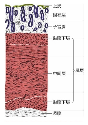 (3)外膜:子宫底部与体部的外膜为浆膜,子宫颈部分为纤维膜。