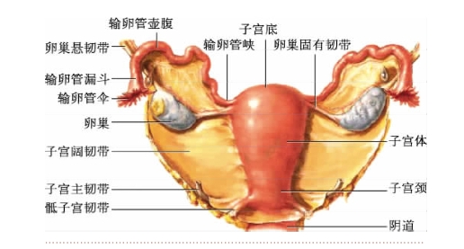 (2)子宫圆韧带:起于子宫前面的上外侧,输卵管与子宫连接处的下方,在阔韧带前层腹膜的覆盖下向前外侧弯行,然后通过腹股沟管止于阴阜和大阴唇的皮下。此韧带是维持子宫前倾的主要结构。