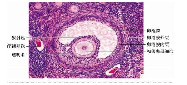 2)生长卵泡:又分为初级卵泡和次级卵泡两个阶段:①初级卵泡:位于卵泡中央的初级卵母细胞体积增大。卵泡细胞由扁平变为立方或柱状,并迅速增殖为多层。卵泡细胞和卵母细胞共同分泌一种凝胶状的糖蛋白,在两者之间呈现为一层嗜酸性的厚膜,称透明带。围绕卵泡的毛细血管、梭形细胞和结缔组织分化形成卵泡膜,与卵泡细胞以基膜相隔(图9-2-6)。②次级卵泡:在促性腺激素刺激下,多层卵泡细胞之间出现一些含液体的不规则腔隙,此时初级卵泡改称次级卵泡(图9-2-7)。随着卵泡的发育增大,小腔逐渐融合成一个较大的卵泡腔,腔内充满卵泡液。卵泡腔的增大使初级卵母细胞及其周围的卵泡细胞被挤至卵泡的一侧,突向腔内,称卵丘。紧靠透明带的一层卵泡细胞为柱状,呈放射状排列,称放射冠。卵泡腔周围的卵泡细胞密集成数层,形成颗粒层。卵泡膜逐渐分化为界限不清的内、外两层。