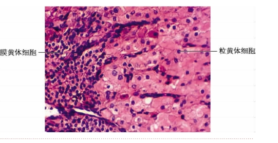 (3)黄体的形成和退化:排卵后,残留在卵巢内的卵泡壁塌陷形成一个暂存的内分泌细胞团,新鲜时呈黄色,故称黄体(图9-2-8)。由颗粒层细胞分化而成的粒黄体细胞呈多边形,胞体大,染色浅。细胞数量较多,分泌大量孕激素,主要为孕酮。来源于内膜细胞的膜黄体细胞体积较小,染色较深,数量较少。两种黄体细胞共同作用,产生一定量的雌激素。