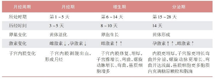 4.子宫内膜周期性变化 自青春期起,在卵巢分泌的雌激素和孕激素的作用下,子宫底部和体部的功能层内膜出现周期性变化,表现为每隔28天左右发生一次内膜剥脱、出血、修复和增生的连续过程,称月经周期。每个周期是从月经第一天起至下次月经来潮的前一天止。