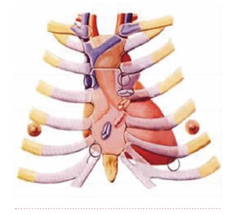 心在胸前壁的体表投影可用下列4点的连线来表示(图10-1-13):①左上点,在左侧第2肋软骨下缘,距胸骨左缘约1.2 cm处。②右上点,在右侧第3肋软骨上缘,距胸骨右缘约1.0 cm处。③左下点,在左侧第5肋间隙,左侧锁骨中线内侧1~2 cm(或距前正中线7~9 cm)处,即心尖的体表投影。④右下点,在右侧第6胸肋关节处。左、右上点的连线为心上界,左、右下点的连线为心下界,右上、下点之间向右微凸的连线为心右界,左上、下点之间向左微凸的连线为心左界。了解正常心的体表投影,对检查和判断心是否扩大有参考价值。