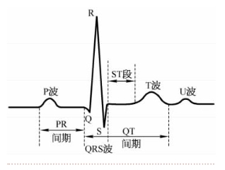 2.QRS波群 左右两心室去极化过程的电位变化。典型的QRS波群,包括三个紧密相连的电位波动:第一个向下波为Q波,以后是高而尖峭的向上的R波,最后是一个向下的S波。正常QRS波群历时0.06~0.10s,代表心室肌兴奋扩布所需的时间;各波波幅在不同导联中变化较大。