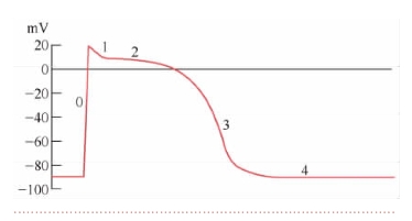 1)1期(快速复极初期):膜内电位由+30 mV快速下降到0 mV左右。其形成机制是由于心肌细胞上的Na+通道已经关闭,Na+内流停止,而膜对K+的通透性增加,K+快速外流,使膜内电位快速下降。