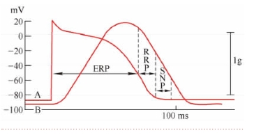 (3)超常期:相当于从复极的-80 mV到-90 mV的时期。在这一期间内,用低于正常阈值的刺激,就可引起动作电位暴发。在此期内,膜电位已经基本恢复,Na+通道也已经复活至静息状态,而膜电位靠近阈电位,故此时若给予心肌一个阈下刺激,就可能产生一个新的动作电位。表明心肌的兴奋性超过正常,称超常期(SNP)。