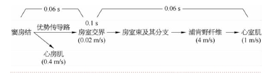 心肌细胞传导兴奋的能力或特性,称传导性。正常心脏内兴奋的传导主要依靠特殊传导系统来完成。传导顺序是:窦房结发出兴奋后,经心房肌传到左、右心房,同时沿“优势传导通路”迅速传到房室结,然后经房室束及其左、右束支和浦肯野纤维到达心室肌。各部心肌细胞传导性的高低不同,故传导的速度也不相同。心房肌为0.4 m/s,心室肌为1 m/s,浦肯野纤维为4 m/s,房室交界区为0.02 m/s。