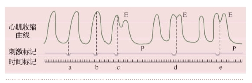 E:期前收缩;P:代偿性间隙刺激;a、b:落在有效不应期内,无反应刺激;c~e:落在相对不应期内,引起期前收缩与代偿性间隙