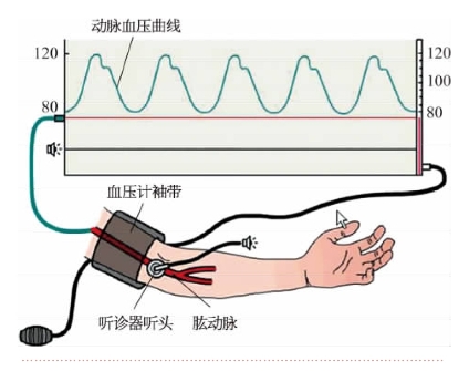 动脉血压是指血液对动脉管壁的侧压力。一般是指主动脉内的血压。因为在大动脉中血压降落很小,故通常将在肱动脉测得的血压代表主动脉压(图10-4-2)。
