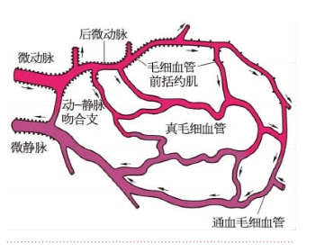 典型的微循环由微动脉、后微动脉、毛细血管前括约肌、真毛细血管、通血毛细血管、动-静脉吻合支和微静脉等部分组成。图10-4-4是一个典型的微循环单元。