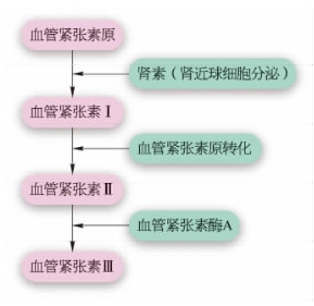 肾素是由肾球旁细胞合成和分泌的一种酸性蛋白酶,经肾静脉进入血循环。血浆中的血管紧张素原,在肾素的作用下水解,变为血管紧张素Ⅰ。在血浆和组织中血管紧张素转换酶的作用下,血管紧张素Ⅰ水解变为血管紧张素Ⅱ。血管紧张素Ⅱ在血浆和组织中的血管紧张素酶A的作用下,再次变为血管紧张素Ⅲ(图10-5-3)。血管紧张素Ⅱ可以通过中枢和外周机制,使外周血管阻力增大,血压升高。此外,血管紧张素Ⅱ可强烈刺激肾上腺皮质球状带细胞合成和释放醛固酮,后者可促进肾小管对Na+的重吸收,并使细胞外液量增加。由于肾素、血管紧张素和醛固酮之间有密切的功能联系,由此提出肾素-血管紧张素-醛固酮系统。