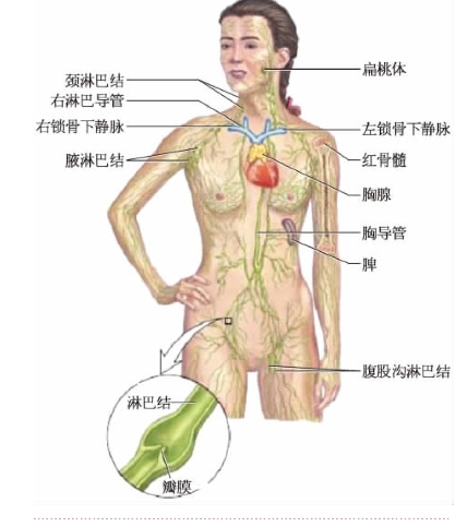 淋巴管由毛细淋巴管汇合而成,管壁结构与静脉相似,但其管径细、管壁薄、瓣膜多,具有防止淋巴逆流的功能。淋巴管分为浅、深两类:浅淋巴管位于皮下(图10-6-1),多与浅静脉伴行;深淋巴管多与深部的血管伴行。淋巴管在向心的行程中,通常经过一个或多个淋巴结。