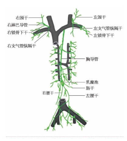 全身各部的淋巴管经过一系列的淋巴结群后,由最后一群淋巴结的输出管汇合成较大的淋巴干。全身共有9条淋巴干(图10-6-3):左、右颈干,左、右锁骨下干,左、右支气管纵隔干,左、右腰干和肠干。