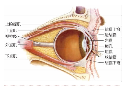 视器即眼,由眼球和眼副器两部分组成。眼球的功能是接受光刺激,将感受的光波刺激转变为神经冲动,经视觉传导通路至大脑视觉中枢,产生视觉。眼副器位于眼球的周围或附近,包括眼睑、结膜、泪器、眼球外肌等,对眼球起支持、保护和运动作用(图11-2-1)。