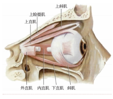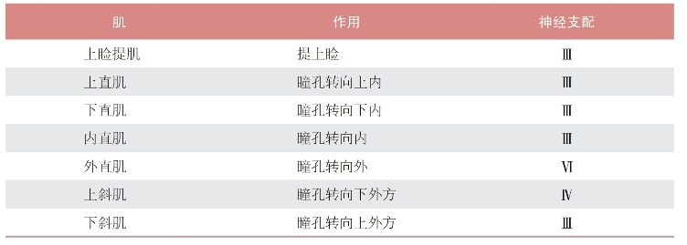 眼球外肌包括运动眼球的4块直肌、2块斜肌和上提上眼睑的上睑提肌,都是骨骼肌(图11-2-13)。各直肌共同起自视神经管周围的总腱环,在眼球中纬线的前方,分别止于巩膜的上侧、下侧、内侧和外侧面。眼外肌的作用和神经支配详见表11-2-1。