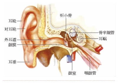 前庭蜗器又称耳,听觉的感受器官是耳,耳的适宜刺激是一定频率范围内的声波振动。耳分为外耳、中耳和内耳三部分(图11-3-1)。外耳和中耳是声波的收集和传导装置,是前庭蜗器的附属器。听觉感受器(听器)和位觉感受器(平衡器)位于内耳。听觉感受器是感受声波刺激的感受器;位觉感受器是感受头部位置变动、重力变化和运动速度刺激的感受器。两者的功能虽不同,但在结构上关系密切。
