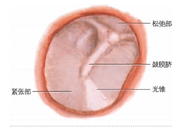 鼓膜位于外耳道与鼓室之间,呈椭圆形半透明的薄膜(图11-3-2)。鼓膜的位置倾斜,外面朝向前、下、外方,其中心向内凹陷,称鼓膜脐。鼓膜的上1/4为松弛部,在活体呈淡红色。鼓膜下3/4为紧张部,在活体呈灰白色。紧张部的前下部有一个三角形的反光区,称光锥。中耳的一些疾患可引起光锥改变或消失。