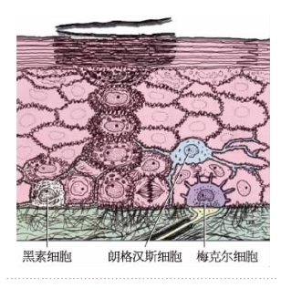 表皮内的非角质形成细胞包括黑素细胞、郎格汉斯细胞和梅克尔细胞(图11-4-3),散在分布于角质形成细胞之间。