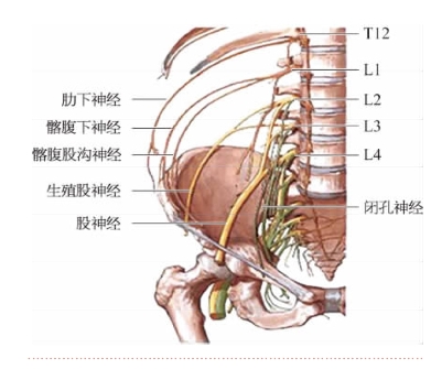1.腰丛组成和位置 腰丛由第12胸神经前支一部分、第1~3腰神经前支和第4腰神经前支一部分组成。腰丛位于腰大肌深面,其分支自腰大肌周围穿出(图12-2-16、图12-2-17)。