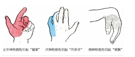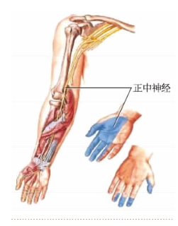 (3)正中神经:正中神经自臂丛发出后,沿肱二头肌内侧缘伴肱动脉下行到肘窝,在臂部一般无分支,然后行经前臂正中,在前臂前群肌之间下降至手掌。正中神经的肌支分布于前臂前群的大部分肌、手肌的外侧群。其皮支分布于手掌桡侧2/3的皮肤和桡侧3个半指掌面及其背面中节和远节的皮肤(图12-2-6、图12-2-10)。正中神经损伤易发生于腕部及前臂,正中神经损伤后可引起“猿手”(图12-2-11)。