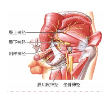 2.骶丛的分支 骶丛的主要分支有:臀上神经、臀下神经、阴部神经、股后皮神经和坐骨神经(图12-2-21)。