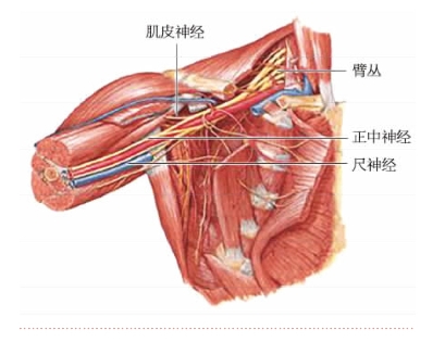 (2)肌皮神经:肌皮神经自臂丛发出后行于臂前群肌之间,肌支支配臂前群肌,皮支分布于前臂外侧皮肤(图12-2-6、图12-2-7、图12-2-9)。