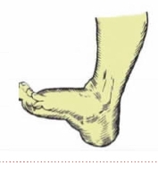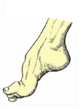 胫神经损伤时可致足底感觉迟钝或丧失。出现足不能跖屈,足内翻无力,不能屈趾,形成“仰趾足(钩状足)”(图12-2-24)。