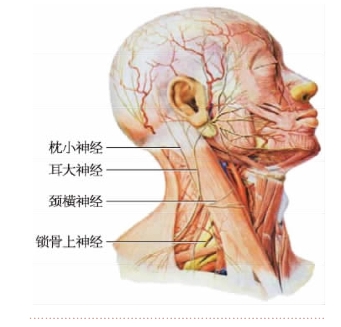 (1)颈丛皮支:集中于胸锁乳突肌后缘中点附近浅出后(图12-2-4),呈放射状分布于枕部及耳郭附近至颈外侧下部、胸壁上部及肩部的皮肤。