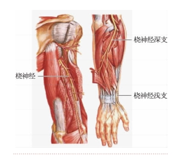 (5)桡神经:桡神经自臂丛发出,粗大,在腋窝位于腋动脉后方(图12-2-6),紧贴肱骨桡神经沟旋向外下,至肱骨外上髁前方分为浅、深2支(图12-2-13)。